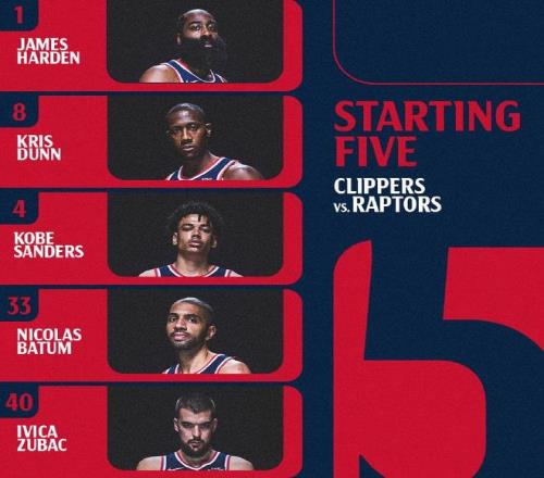 快船:哈登、巴图姆、祖巴茨、邓恩、桑德斯