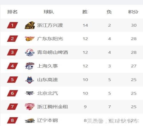 排在积分榜第四名则属于上海队,他们的战绩则是12胜3负,由于少赛一轮的缘故,上海队在排名上稍微吃亏。只能暂时屈居广东队和青岛队之后,排在积分榜第四名。排在积分榜第5名则是山东队,这一轮比赛他们爆冷输给了江苏队,遭遇到本赛季最惨一败。目前,球队的战绩是10胜5负,力压北京队排在积分榜第5。而北京队则紧随其后,排在积分榜第6名。积分榜第7名则是浙江队,他们的战绩为9胜7负。