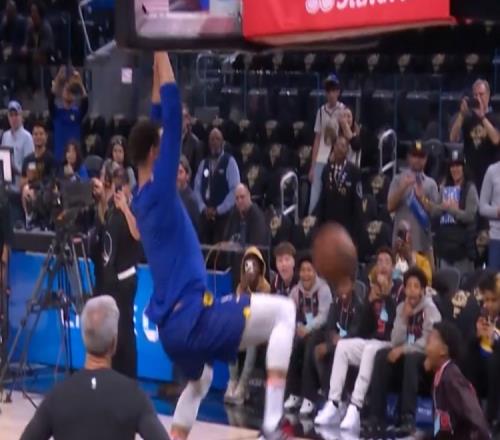 等等这是谁赛前热身库里完成空接暴扣惊呆场边“小学生”