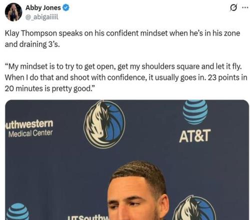赛后被问到本场比赛自己状态为何如此神勇,克莱表示“我的心态就是找到空位,调整好姿势然后果断出手,当我这样做时投篮通常都能命中,20分钟拿23分已经是不错的表现啦。”